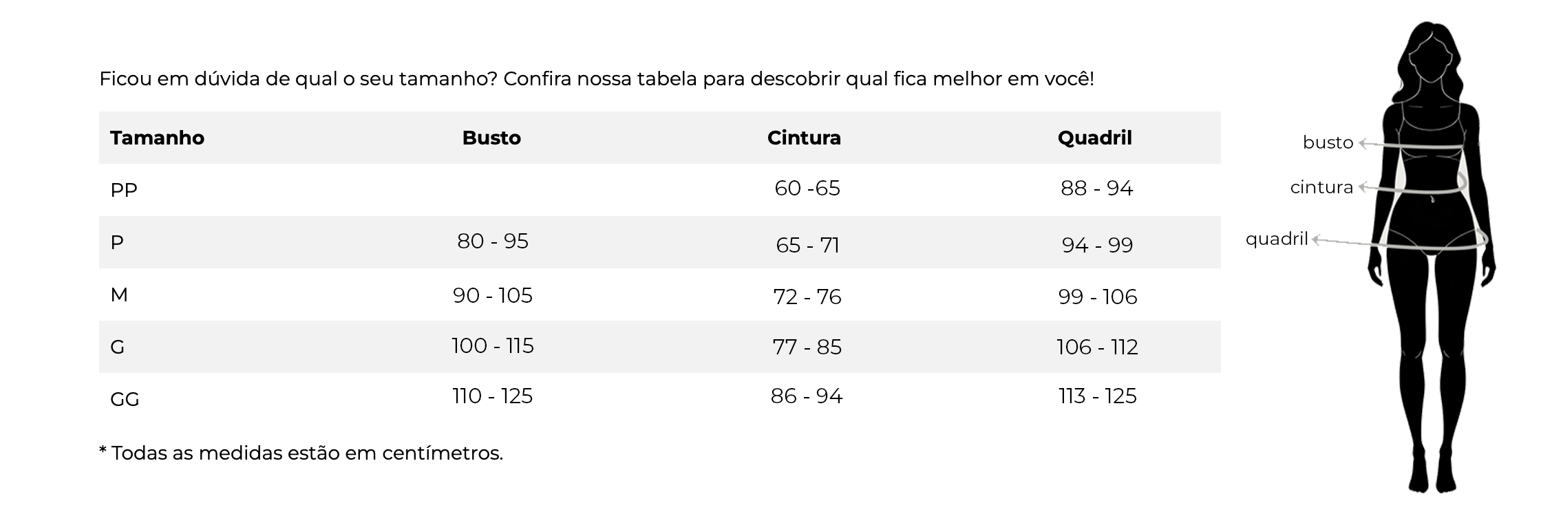 PP (34/36): Cintura 65–75 cm | Quadril 100 cm | Comprimento 30 cm